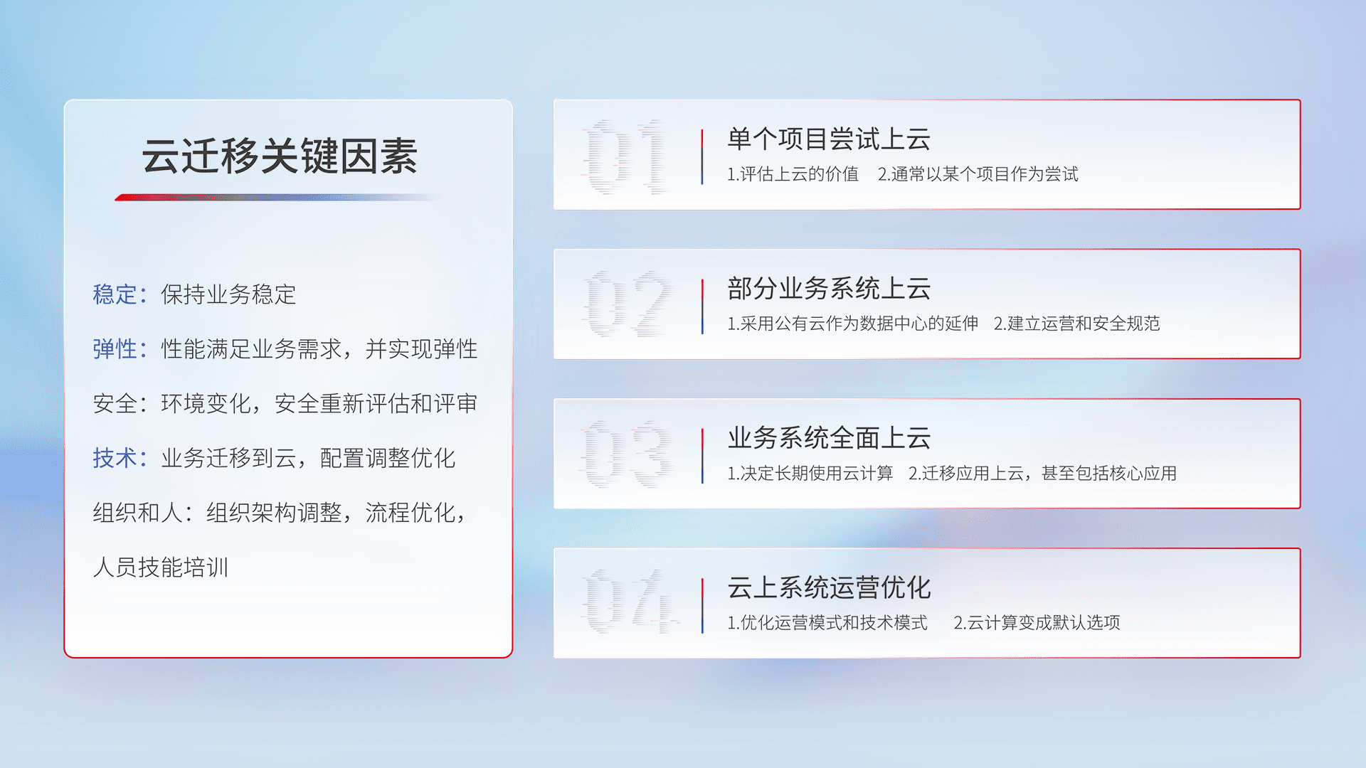 结合实际业务,,,,从规划设计、、、云平台选型、、云原生改造、、、数据迁移、、集成交付,,,迁移全过程为客户识别最佳上云路径,,,,做好风险识别管理,,设计网络架构、、、、身份权限、、、安全审计合规、、、操作审计、、、日志审计、、、监控告警策略、、、多站点容灾设计等,,对云上基础设施进行整体规划,,提升IT治理水平,,,以满足弹性、、高可用、、、高性能的需求。。。